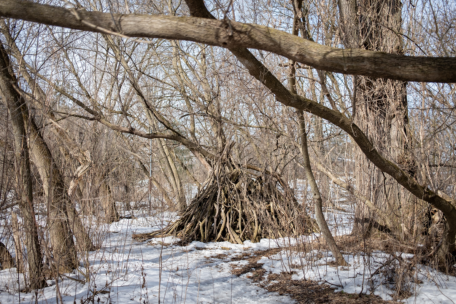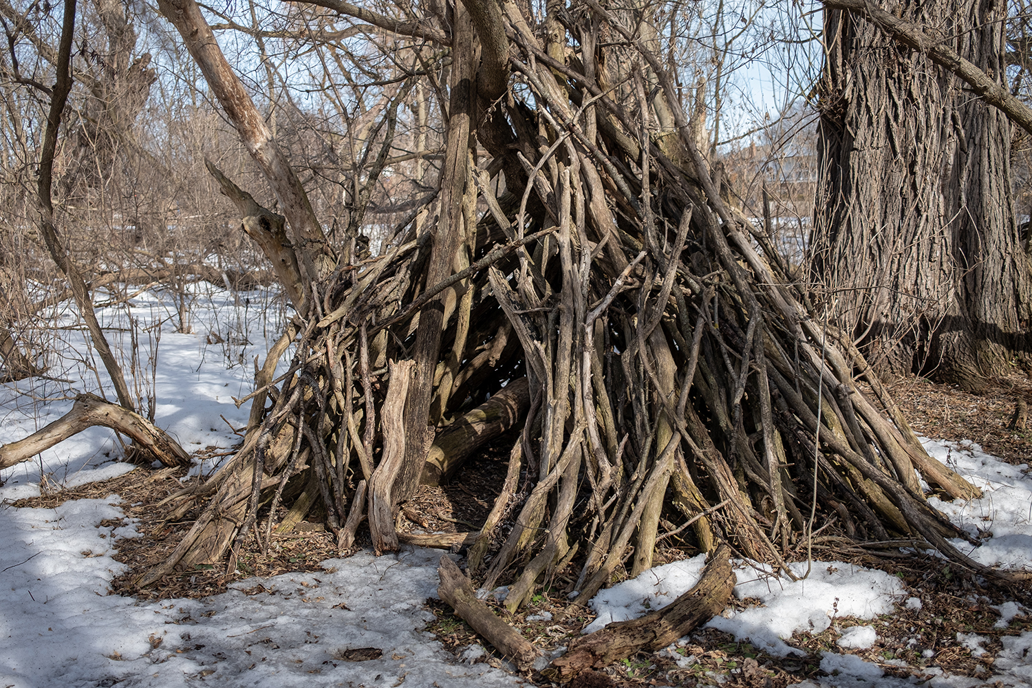 Nothing much is wholly left to chance here… or deliberation. It just is. The branches fell where they fell, by wind and rot. And far from unusual in urban wooded areas, someone has gathered the fallen branches and used them to build something. People collect, people organize, and people build. Necessity is not always the impetus but neither is chance.
